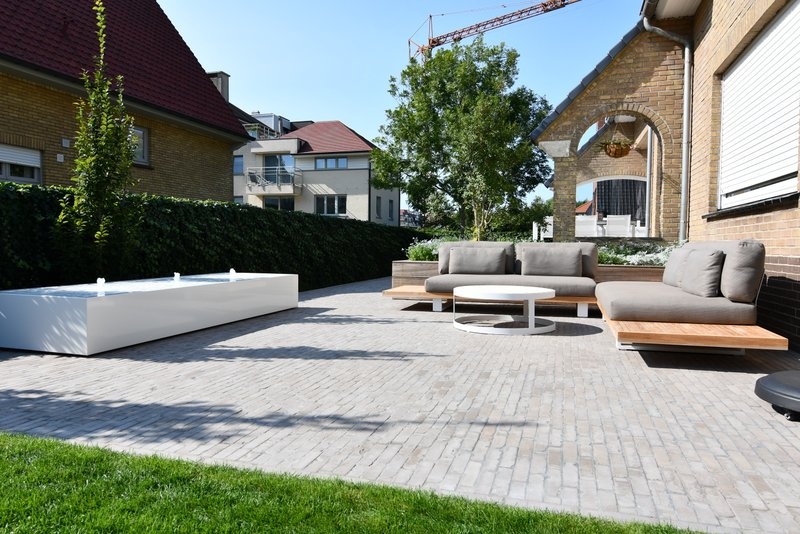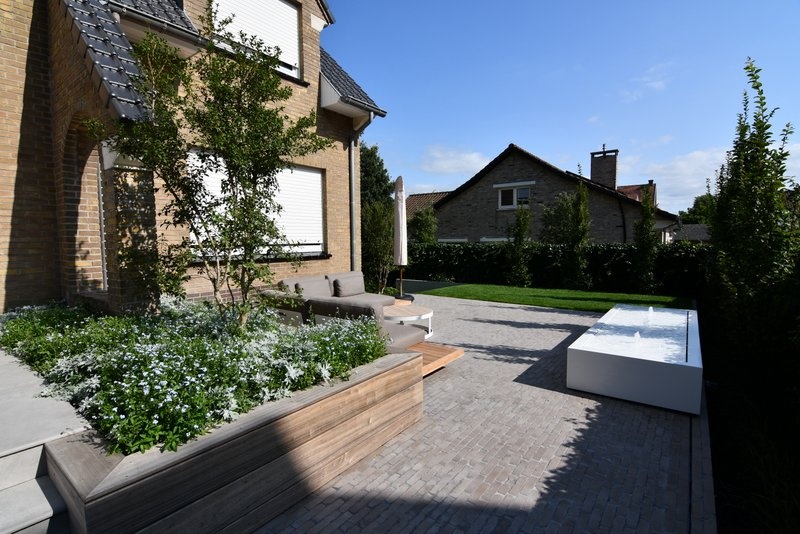 In deze gezellige eigentijdse tuin kunt u genieten in alle rust. De combinatie van de bodembedekkende zomerbloeiers en lava zorgen voor een uiterst onderhoudsvriendelijke tuin. De niveauverschillen werden opgevangen door keermuren en hellingen. Er werd gekozen voor een houten terras in combinatie met kleiklinkers en volkeramische tegels. 's avonds zorgt de tuinverlichting en het geluid van het waterelement voor een oase aan rust. De automatische tuinberegening zorgt voor een groen gazon het ganse jaar door.