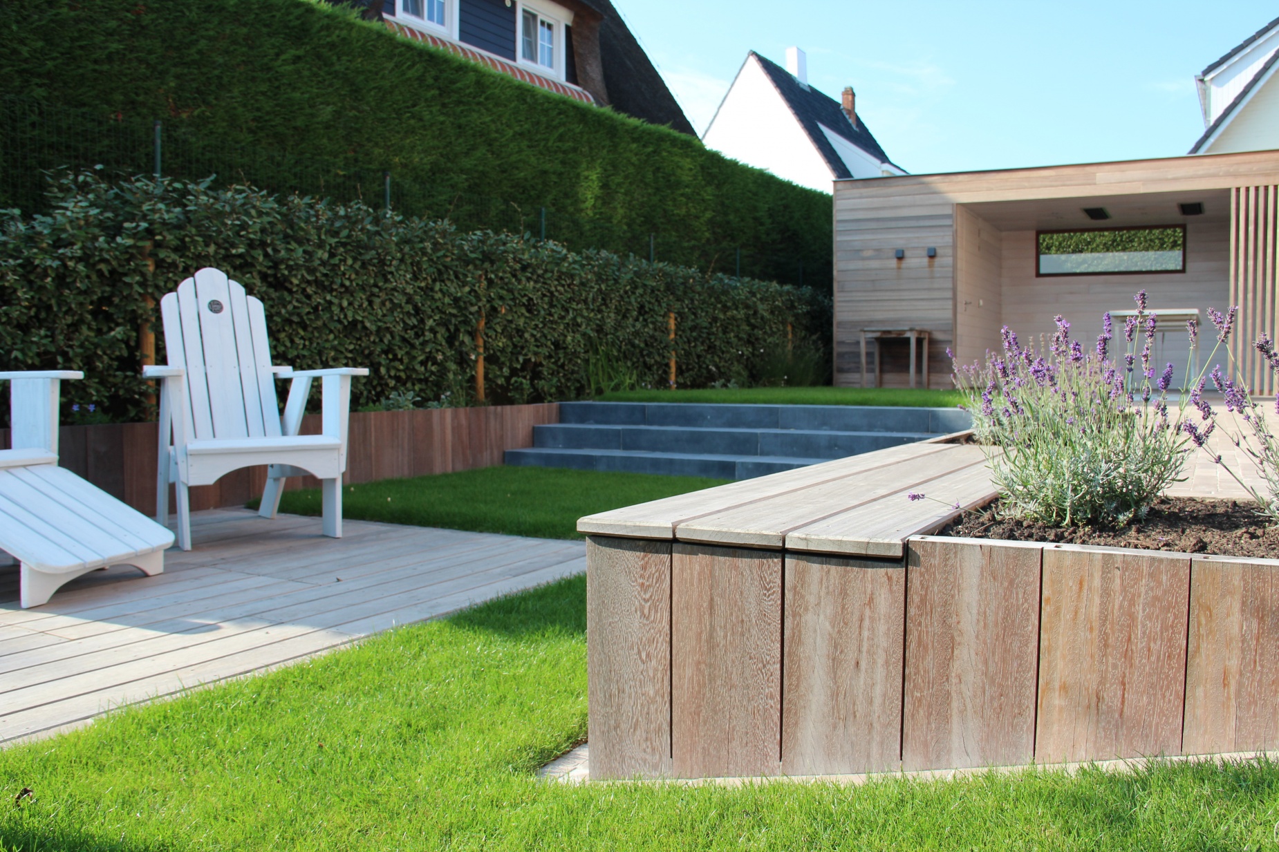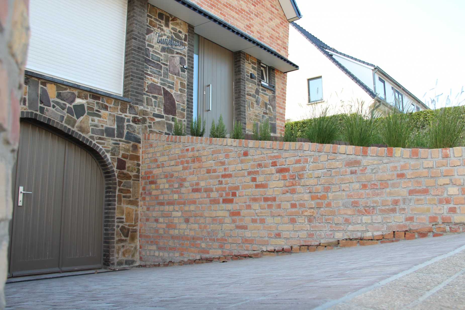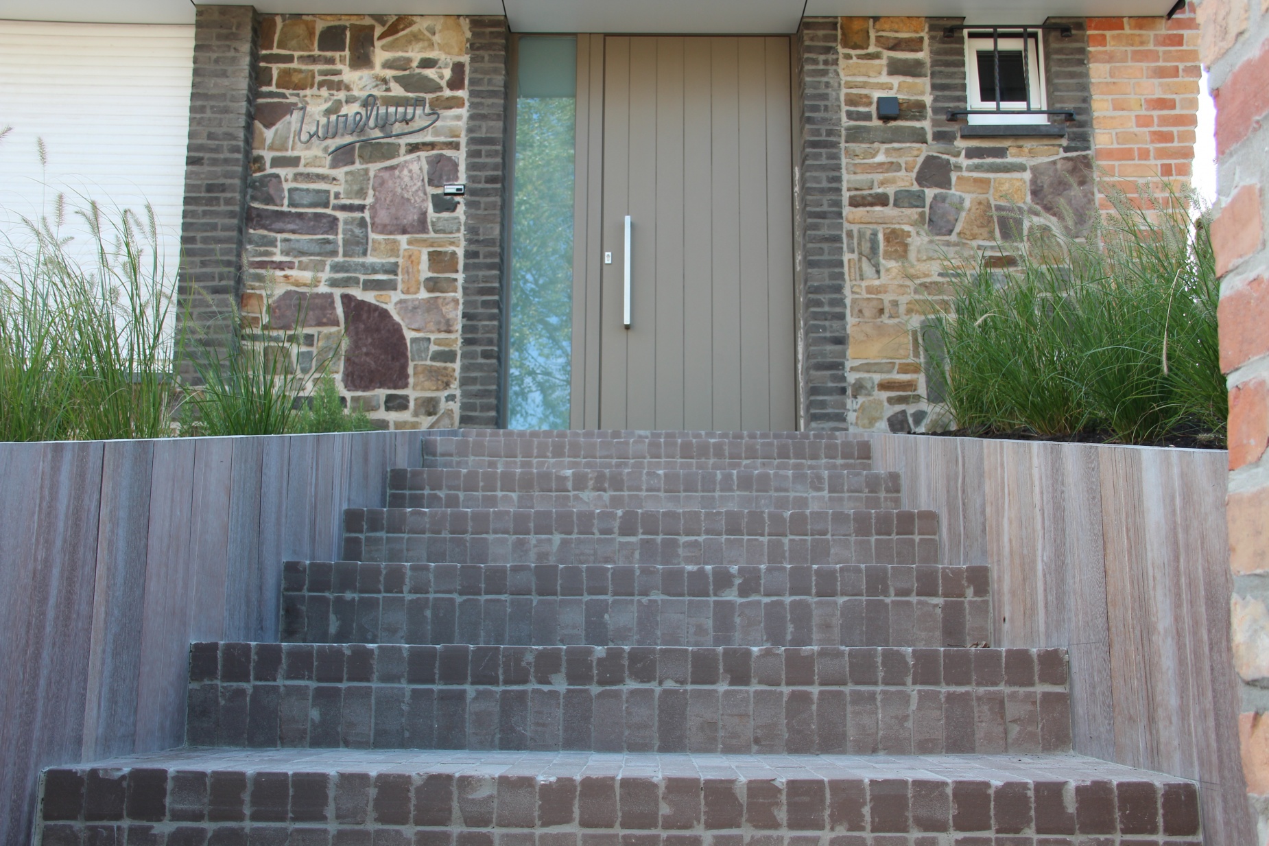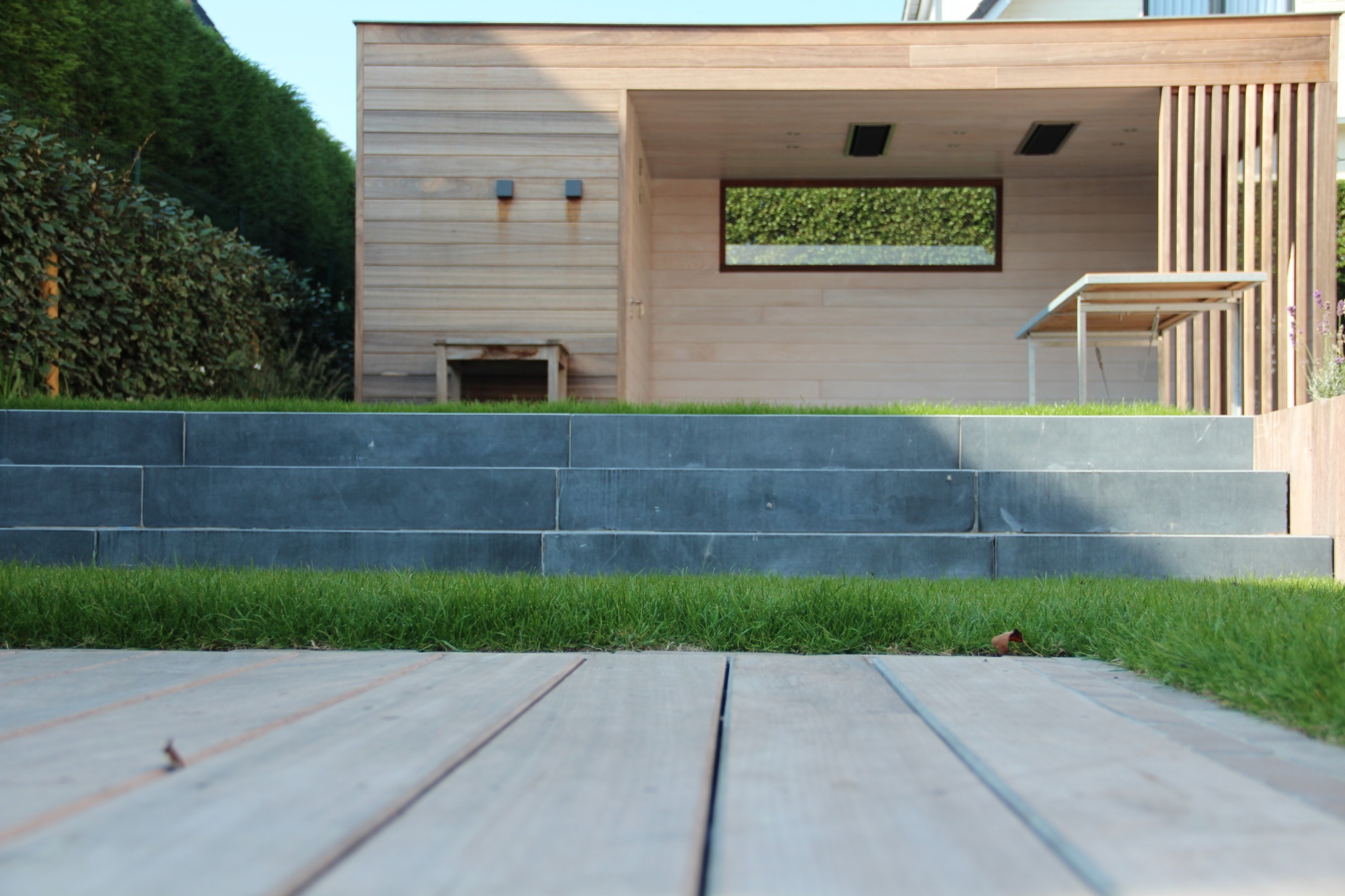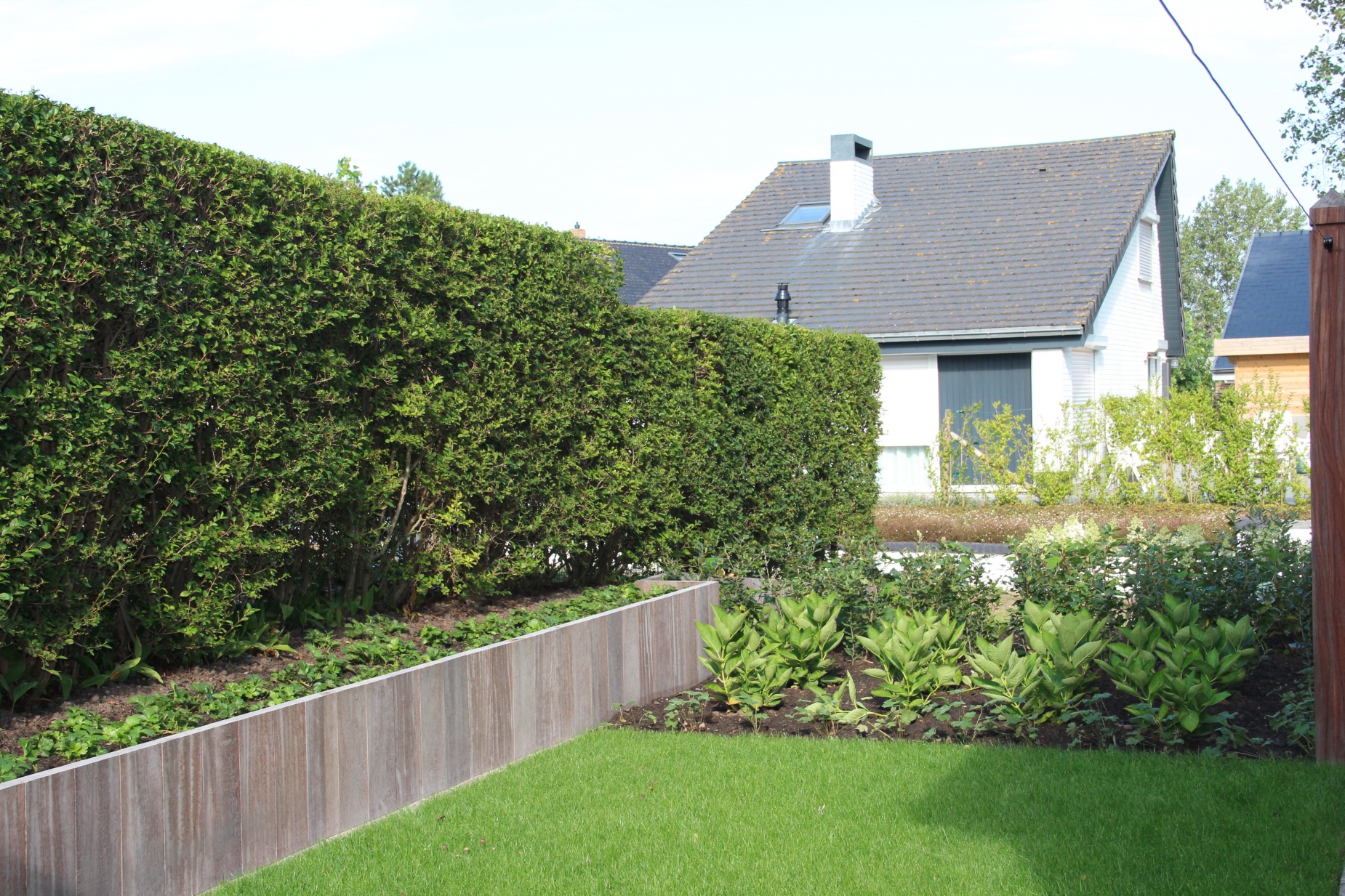 De volledige oppervlakte van deze kleine en alledaagse tuin biedt heel wat mogelijkheden. De verschillende hoogteniveaus worden opgevangen door keermuren met ingewerkte zitbank, waardoor een functionele omgeving ontstaat waar men ten volle kan van genieten. De schuine helling zorgt bewust voor een gemakkelijke doorgang met een grasmaaier.