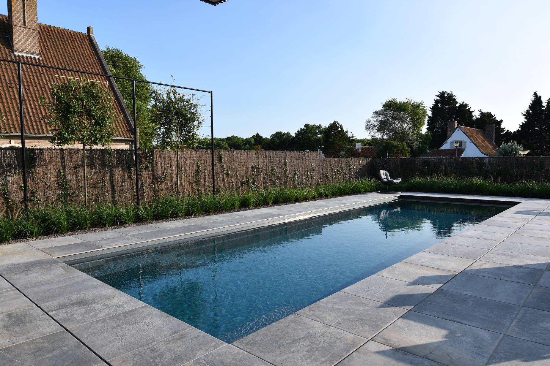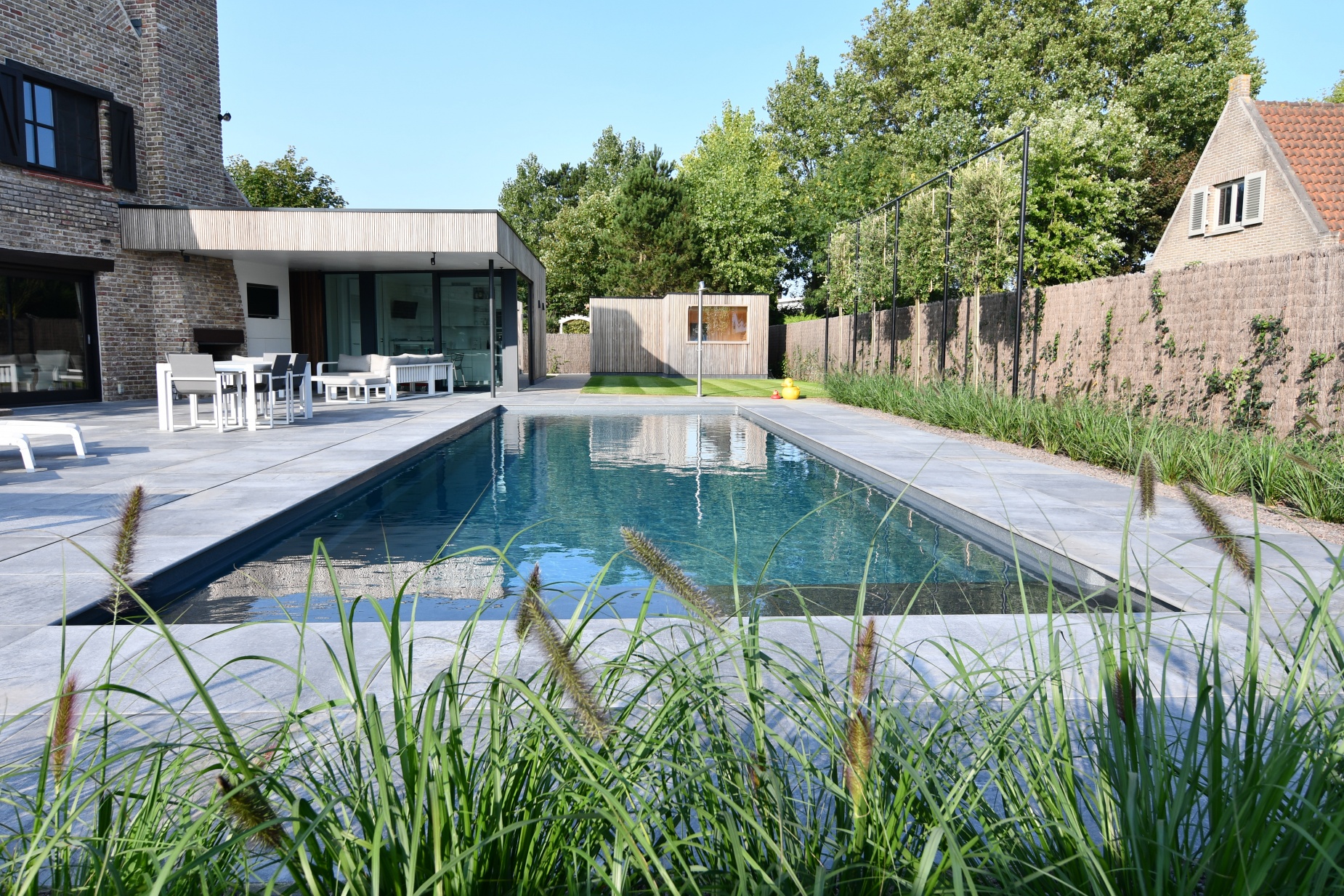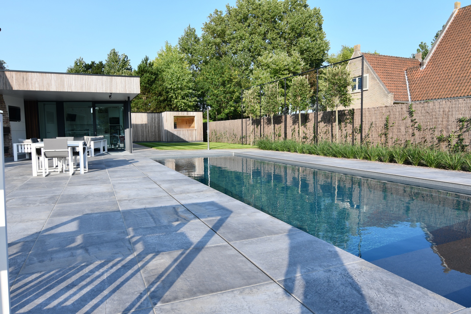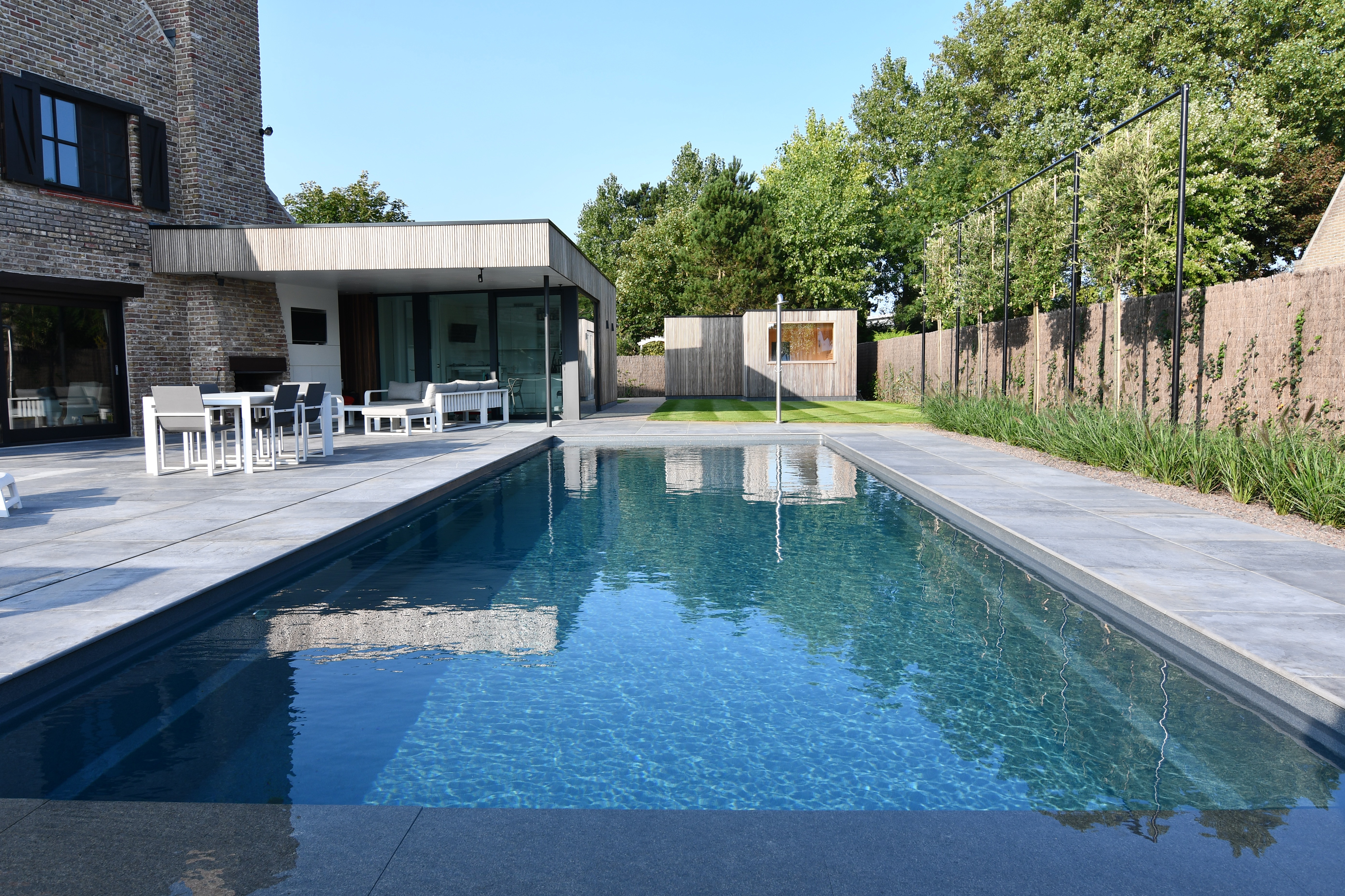 Bij de realisatie van dit tuinproject werd de bestaande tuin volledig afgegraven. De hoogteverschillen werden opgevangen waardoor een vlakke en grote tuinomgeving werd gecreëerd. Een zwembad, eigen petanqueplein, en extra tuinberging zorgen ervoor dat met volop kan genieten van dit pareltje. De leibomen zorgen voor privacy. Voor het zwembad werd gekozen voor een keramisch composiet monoblock hoogwaterstand XXL-Trainer 1330 x 450 Exclusieve Line kleur Nova Antracite met hoogkwalitatieve technieken.