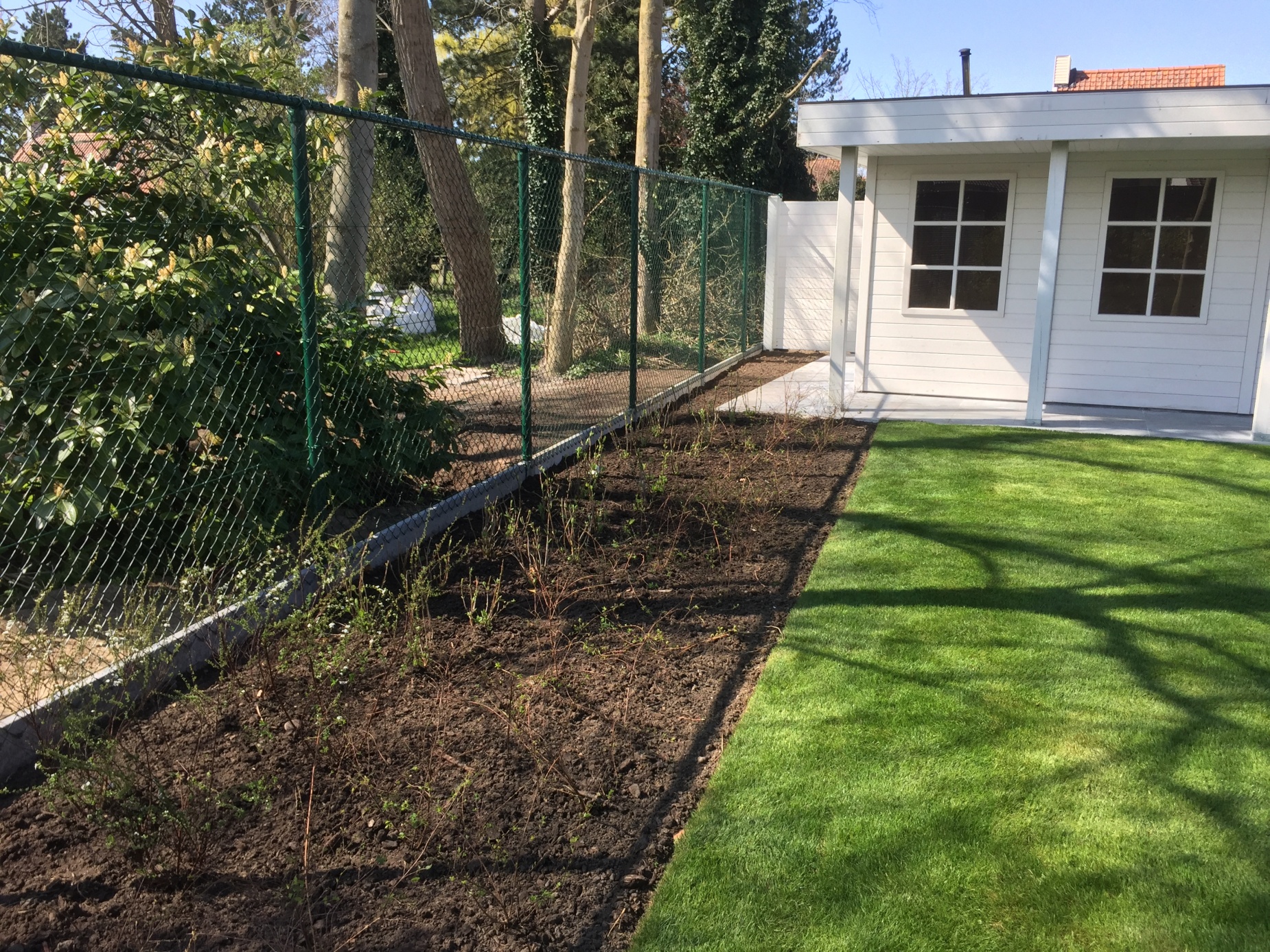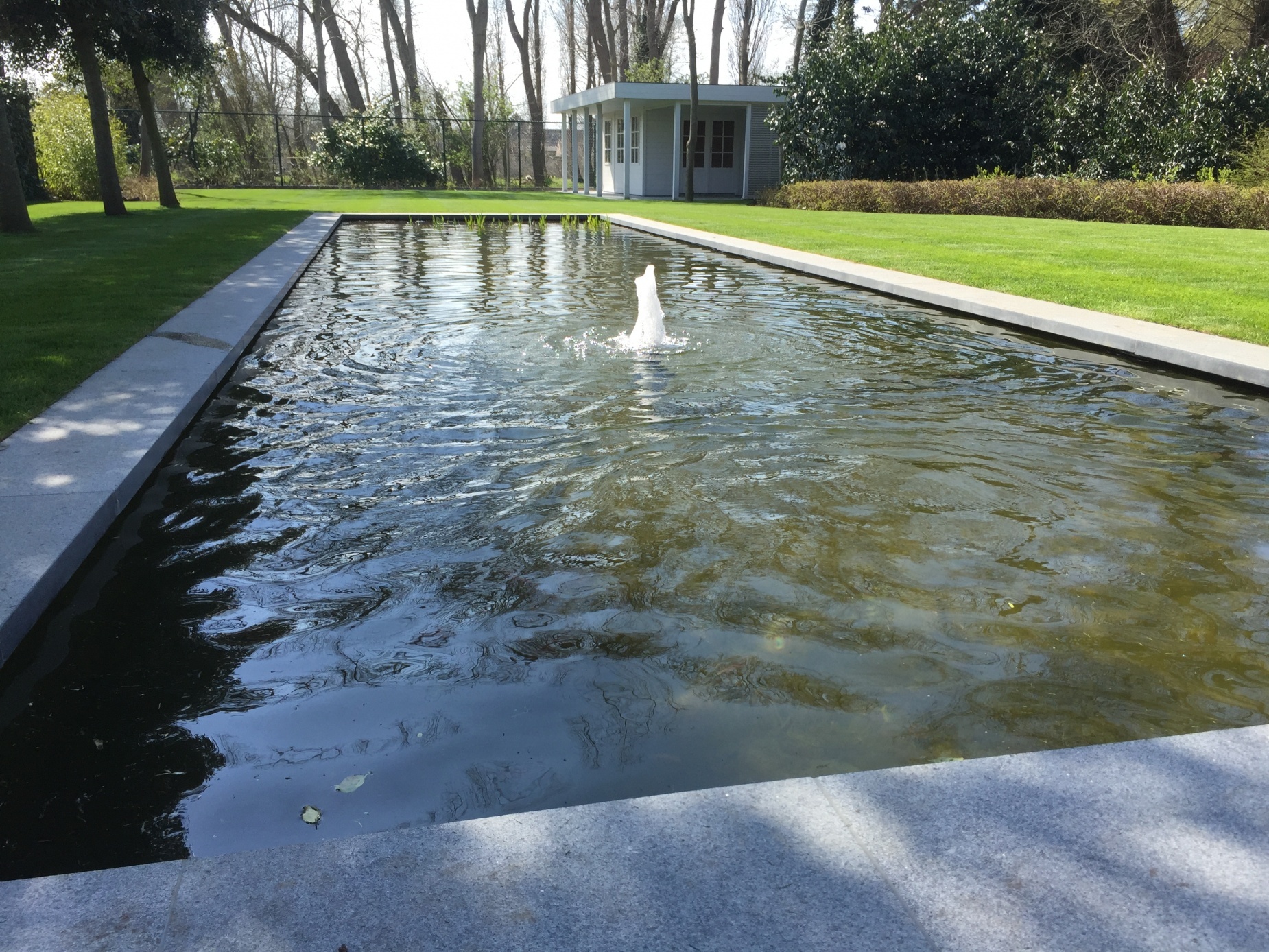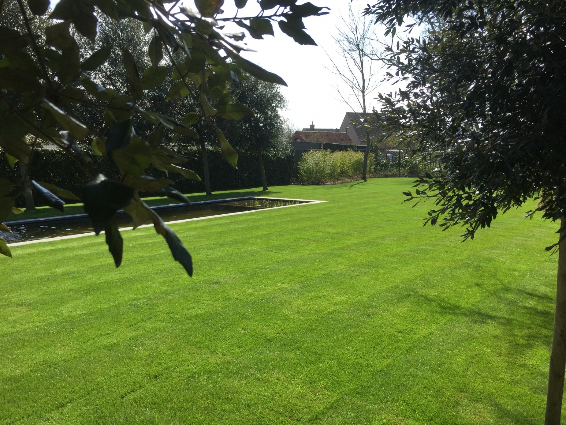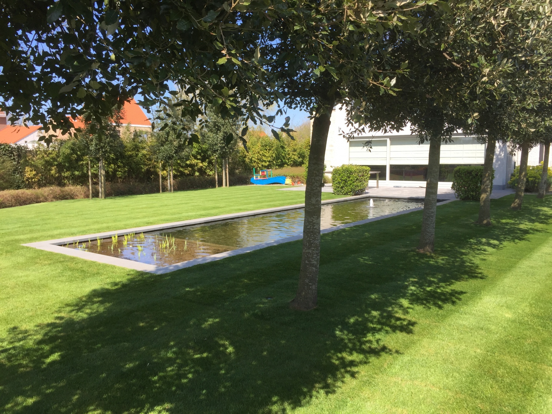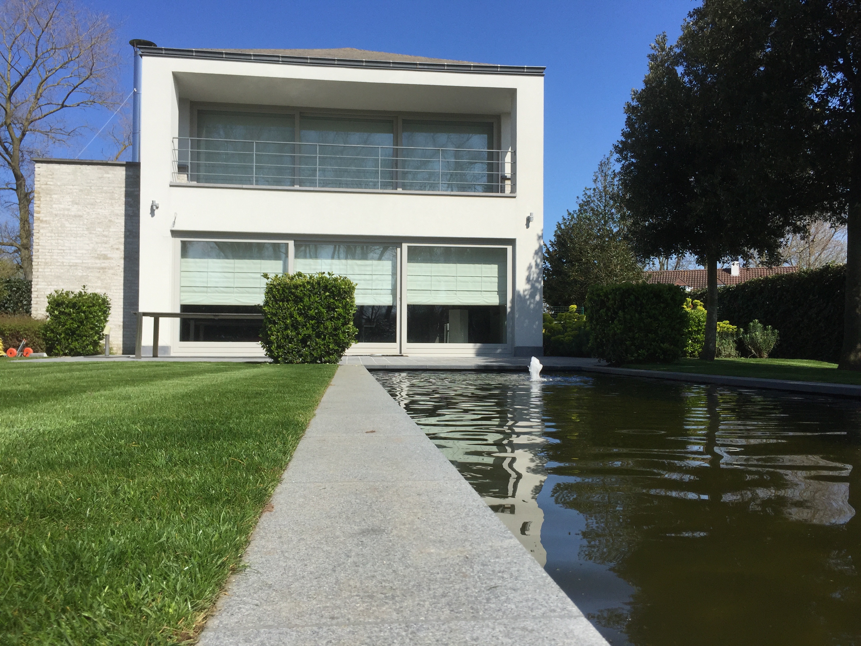 Bij deze renovatie en uitbreiding van een bestaande tuin werd gekozen voor een natuurlijk en strakke zwemvijver in het verlengde van de woning. De weerspiegeling van de woning en de bomen op het water creeërt een rustgevend en verruimend gevoel. Door het gebruik van natuurlijke filters in de zwemvijver worden goede bacteriën gestimuleerd en wordt de vijver voorzien van uiterst helder water. Er werd gekozen voor een kleine waterpartij die 's avonds samen met de tuinverlichting onder de bomen, zorgt voor een onovertroffen rustgevende sfeer.